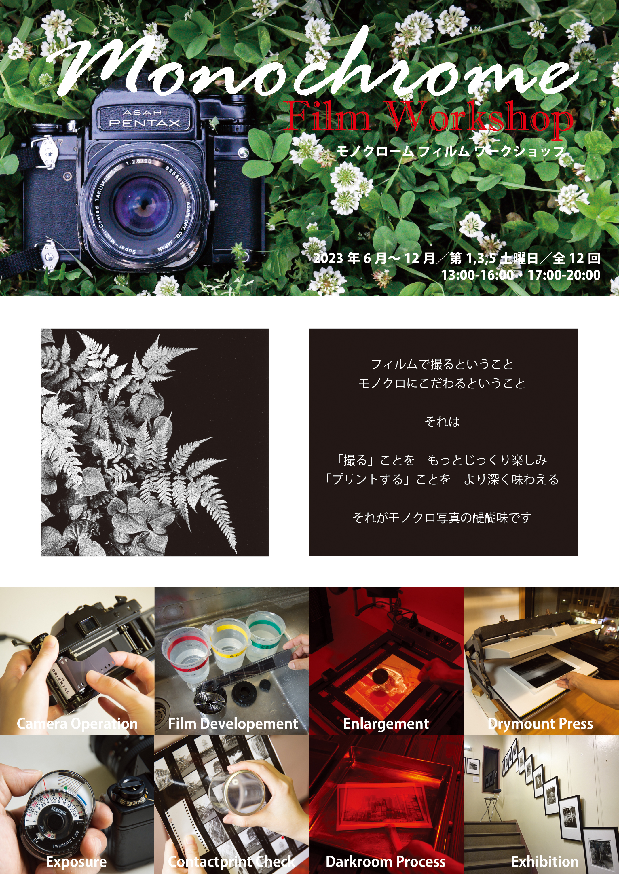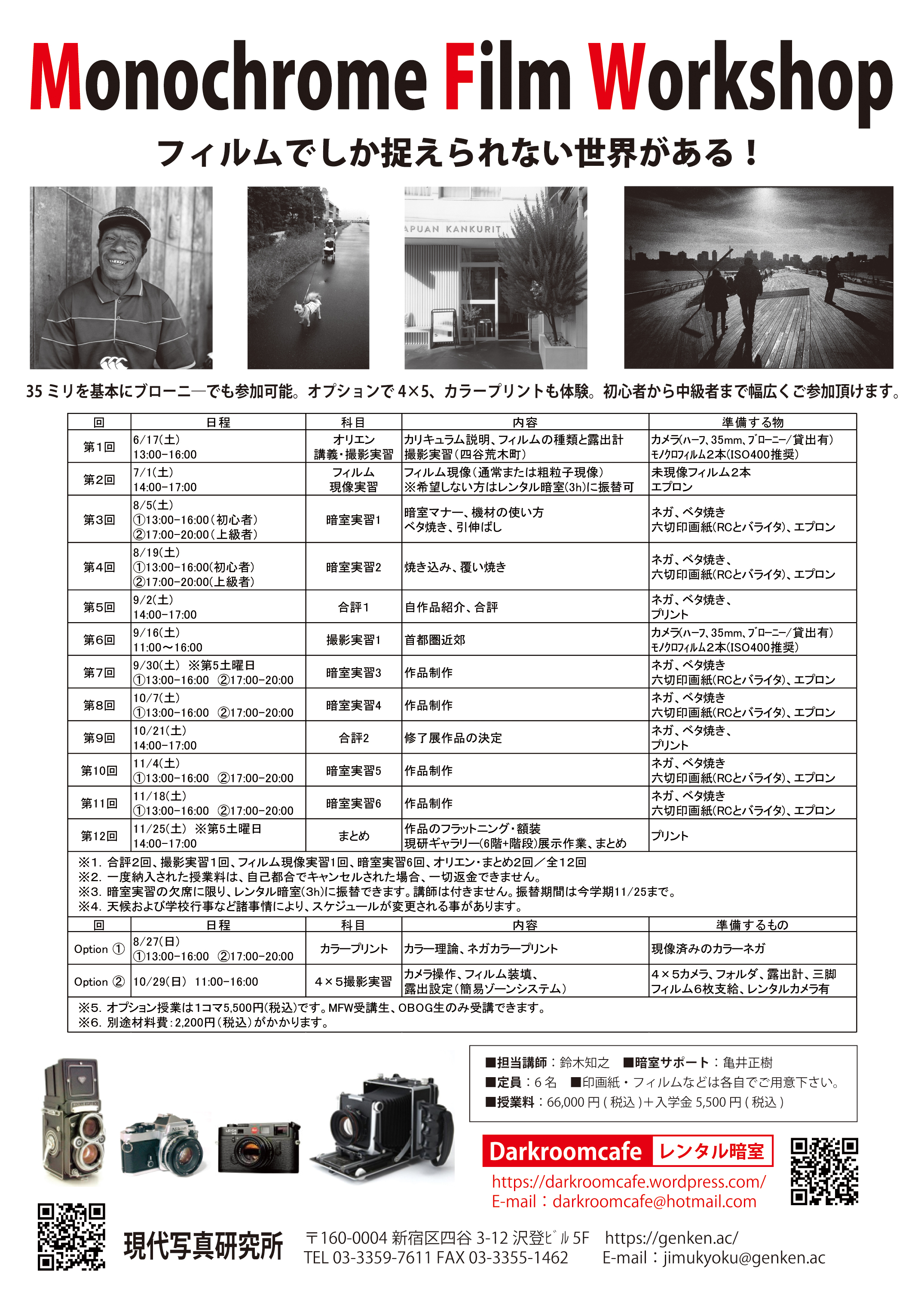 35ミリを基本にブローニーでも参加可能。オプションで4x5、カラープリントも体験。初心者から中級者まで幅広くご参加いただけます。